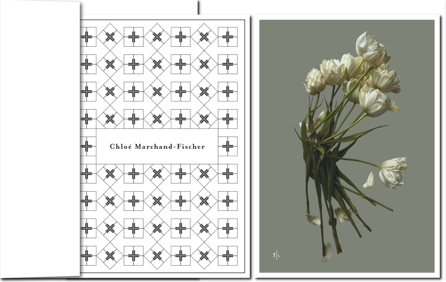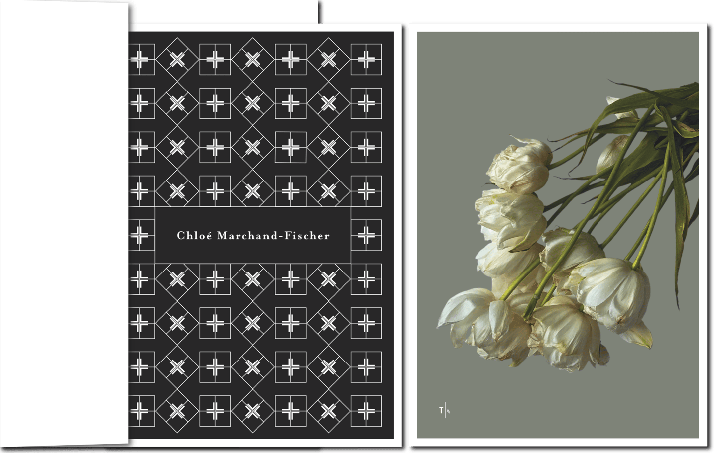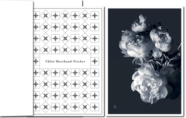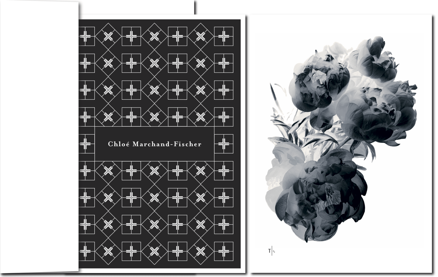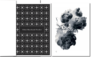 MEMORIAM ist ein imposantes Zwei–Karten–Design. Die erste Karte zeigt den feierlich gerahmten Namen des verstorbenen Menschen. Die elegante Sachlichkeit des Ornaments wird kontrastiert durch die zweite, emotionalere Karte; sie ist das »schöne Bild«, eine Widmung und Würdigung, ein letztes Geschenk.